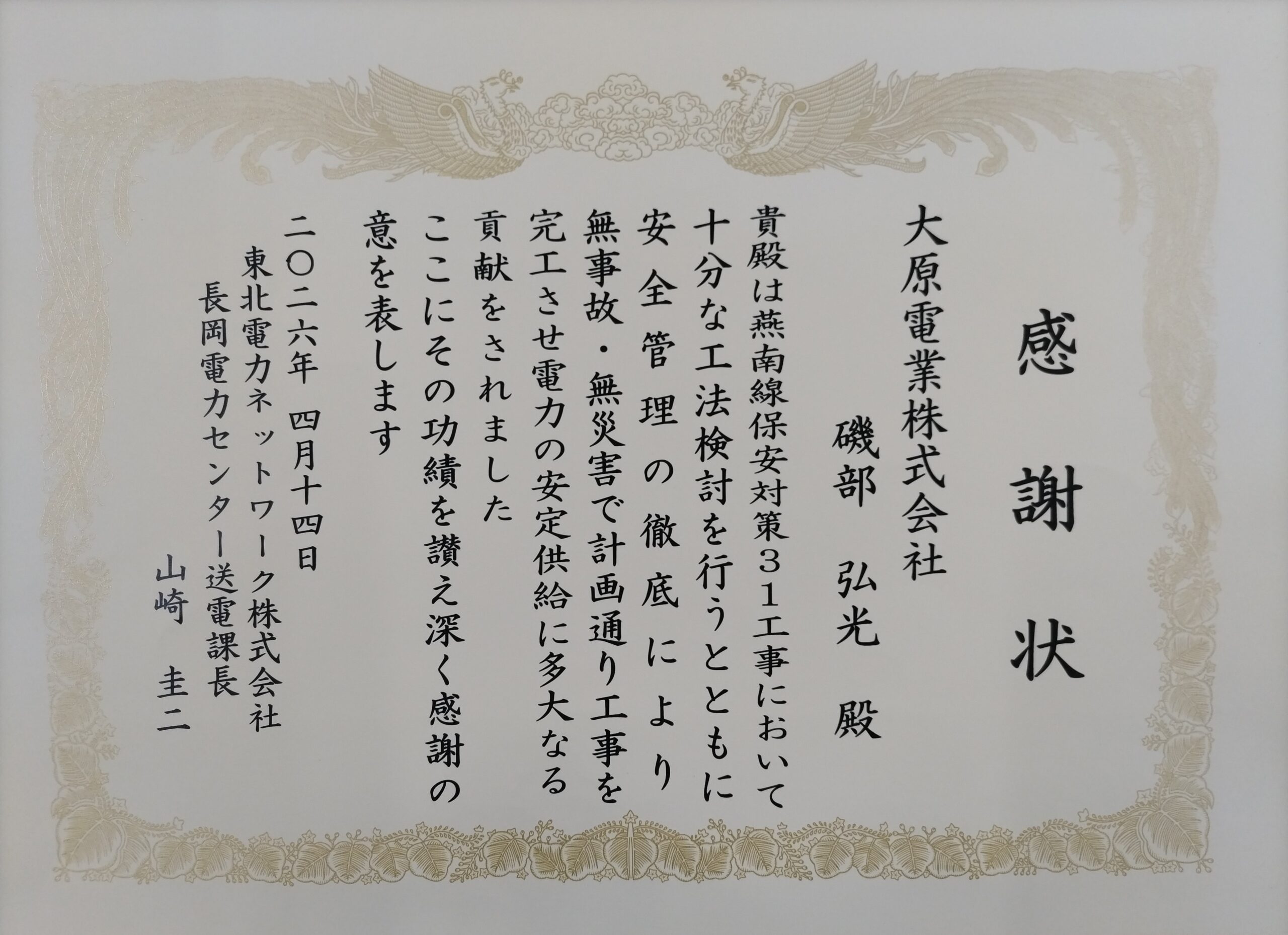 東北電力ネットワーク株式会社様より感謝状をいただきました