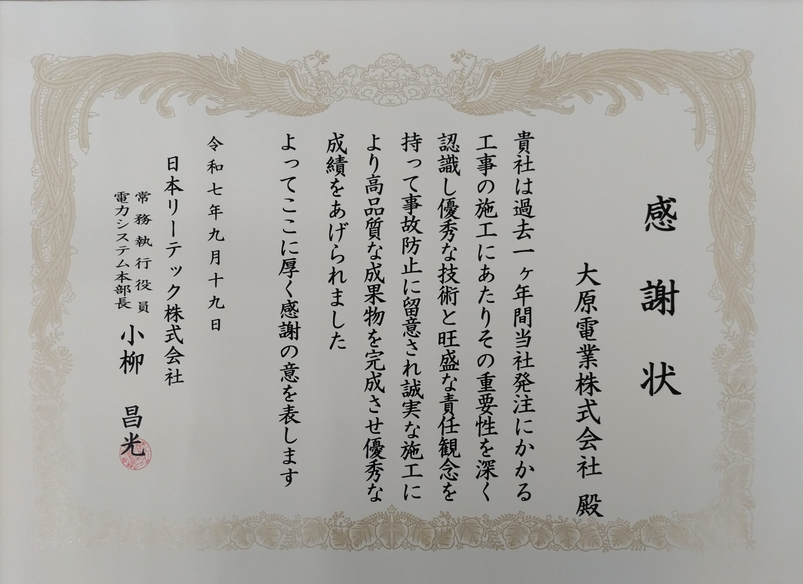 9月19日、日本リーテック株式会社様より、過去一年間の受注工事のおいて、
